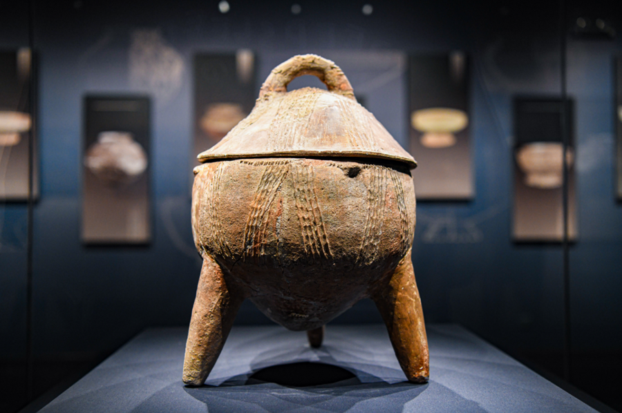 这件陶盖鼎是夹砂黄褐陶质地,“陶泥中掺入了细砂或碎蚌壳,这样可以增强陶器强度,更加耐热。”潘晓庆介绍。它的三支长腿稳稳支撑住腹部微鼓的鼎身,鼎身、鼎盖有几道“大手笔”的泥条纹。细看鼎口,密布着一圈锯齿状的窄堆纹,还安上了四个对称的盲鼻。