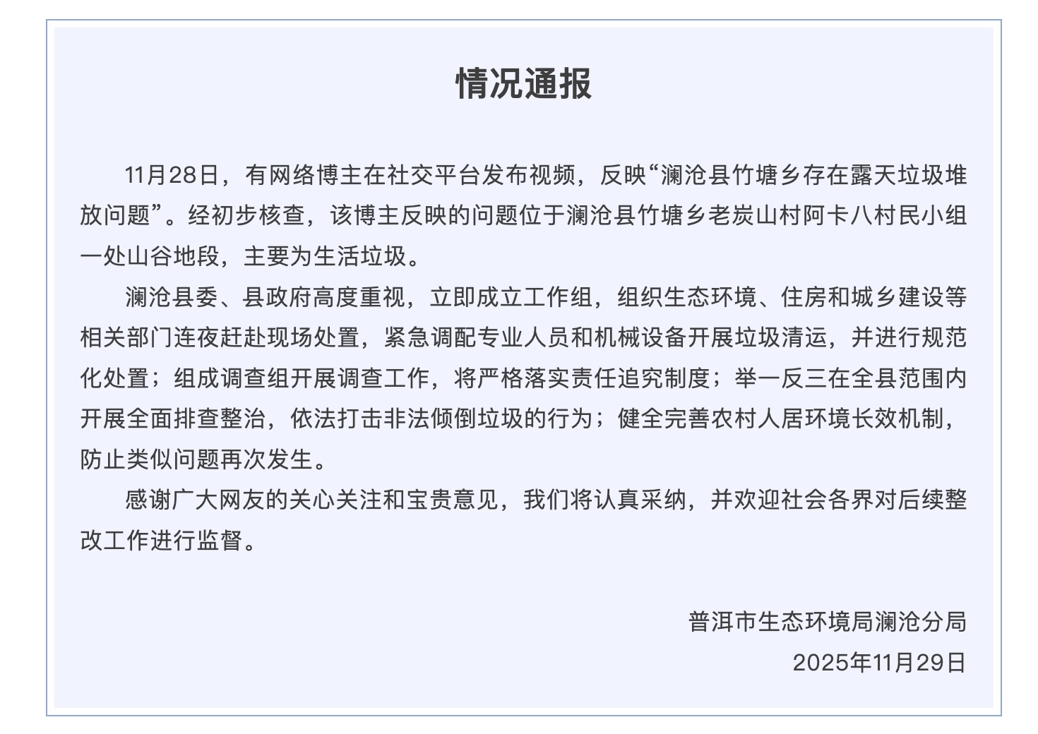 11月28日,有网络博主在社交平台发布视频泸深在线,反映“澜沧县竹塘乡露天垃圾堆放问题”。云南省普洱市生态环境局澜沧分局11月29日发布情况通报称,当地已紧急开展处置,涉事区域位于普洱市澜沧县竹塘乡老炭山村阿卡八村民小组一处山谷地段泸深在线,主要为生活垃圾。